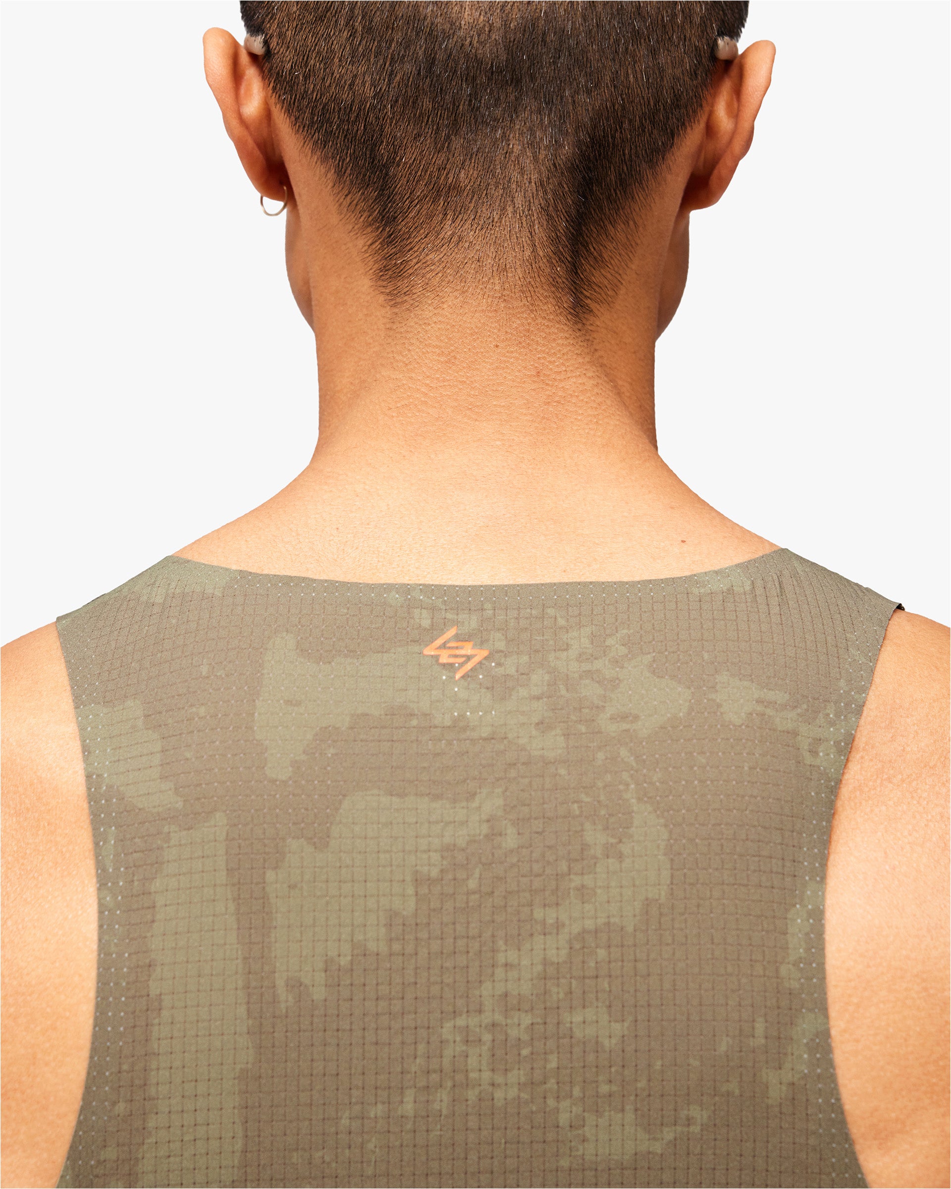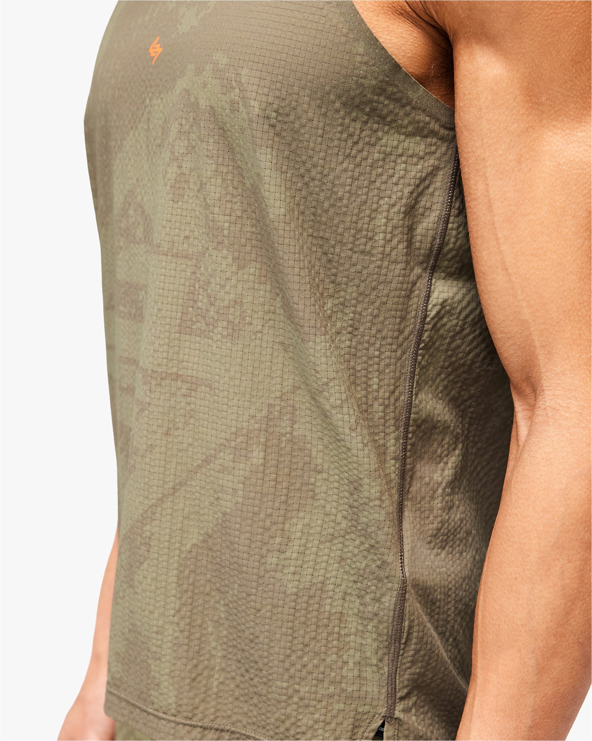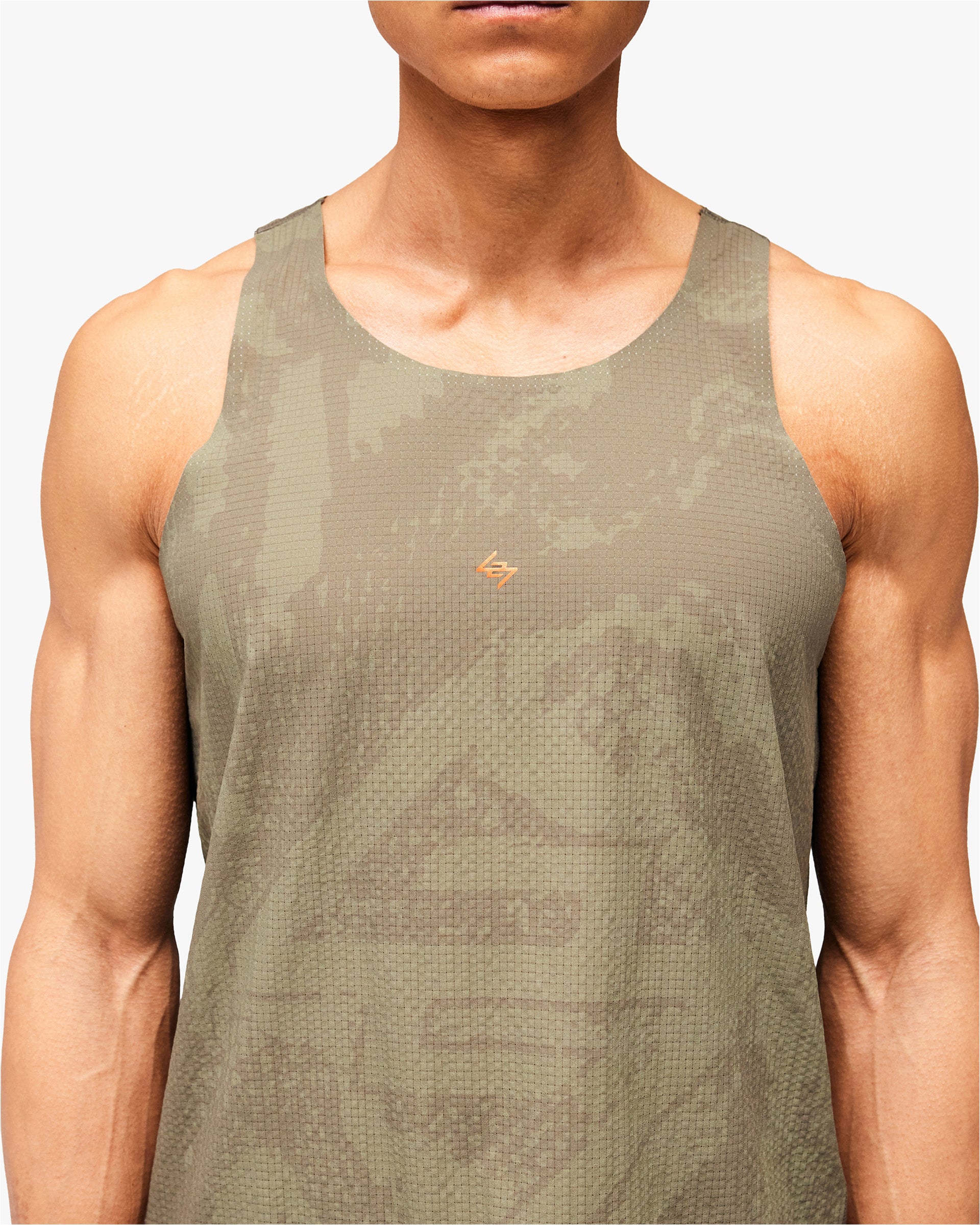 Introducing the 247 Los Angeles Singlet. Built for distance running in high temperatures, this lightweight racerback singlet is constructed from perforated mesh fabric with a tonal printed finish across the collection's signature pattern. The scooped neckline and side splits deliver unrestricted movement and maximum airflow, finished with an orange 247 logo at the chest.