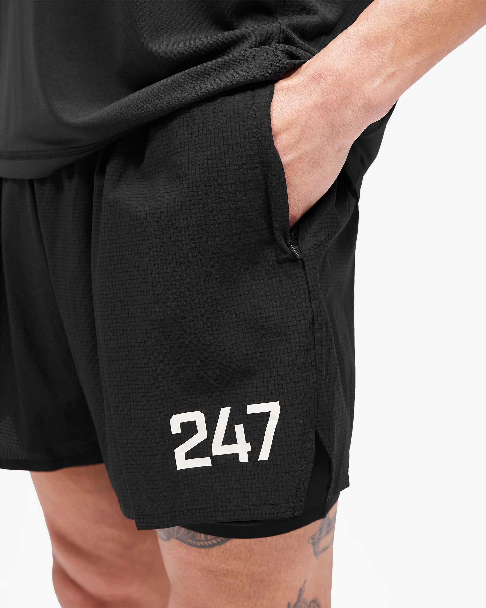 Key features include a 5-inch inseam for optimal freedom of movement, 247 number branding and logo for a stylish look, 4-way stretch for mobility, and multiple zip pockets for secure storage. The combination of an outer stretch ripstop layer and an internal tight provides both support and flexibility.