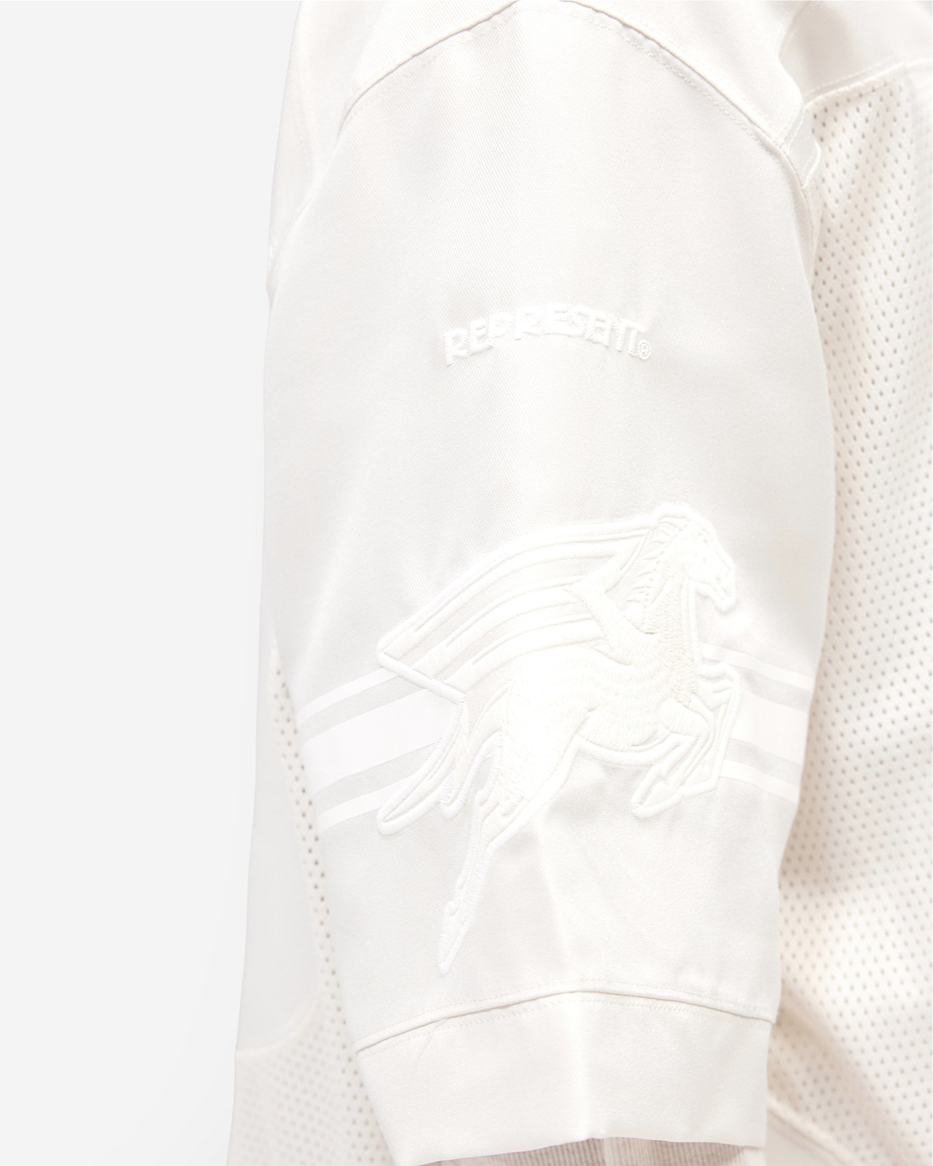 The construction blends multiple techniques. Twill fabric forms the base, contrasted with mesh panels that add visual dynamism and breathability. Graphics are applied in a trio of methods—applique, embroidery, and print—creating layered visual interest and textural depth. The result is a piece that reads as performance-inspired sportswear whilst maintaining the refined construction standards Represent applies across all categories. This is wearable nostalgia with contemporary purpose.