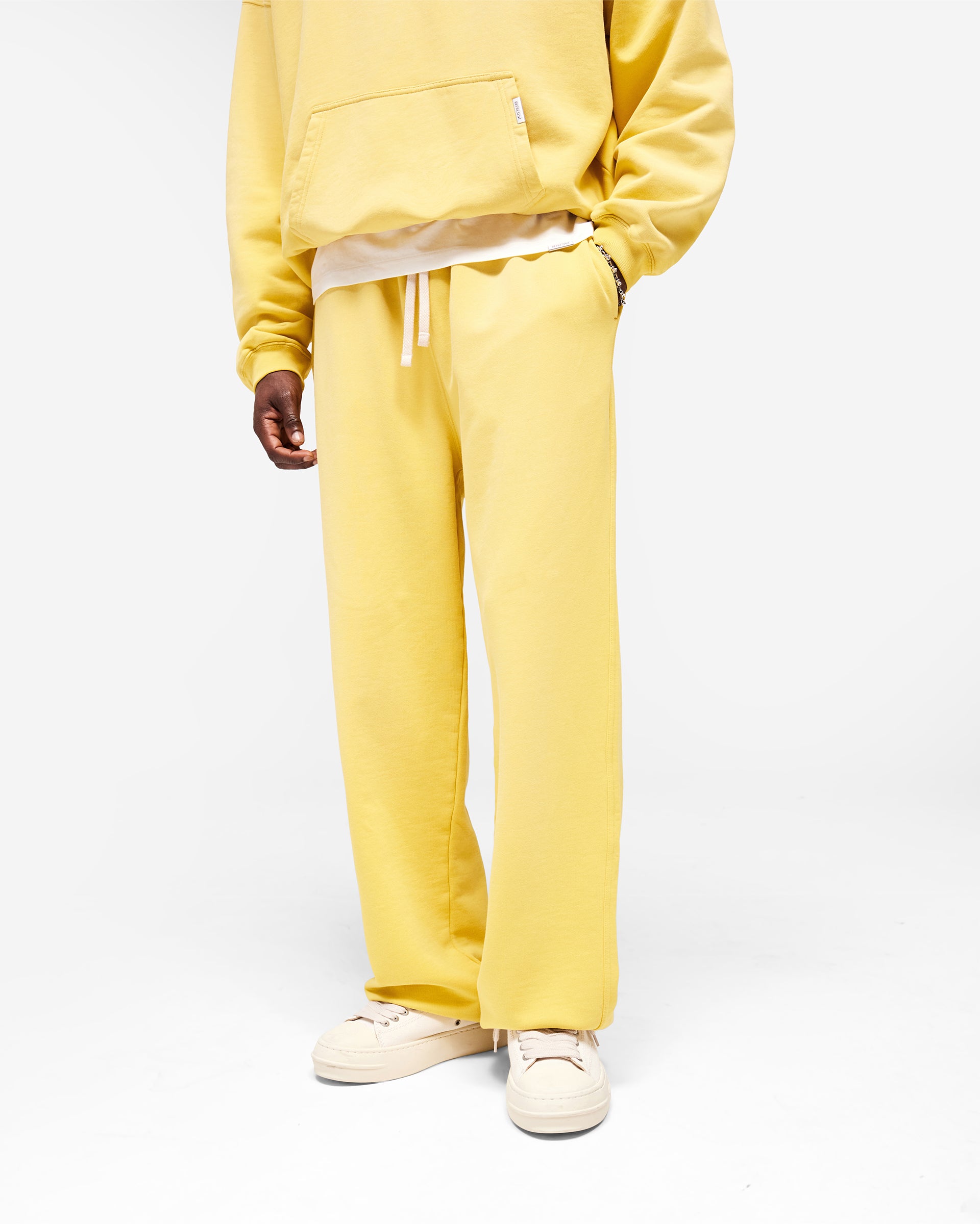 Introducing the Initial Wide Leg Cuffed Sweatpant in Canary Yellow, a relaxed sweatpant crafted from 390gsm cotton with a pigment spray wash for a vibrant, textured finish. The Initial 2.0 fit delivers a wide leg silhouette with elasticated cuffs for a clean, tapered finish at the ankle.