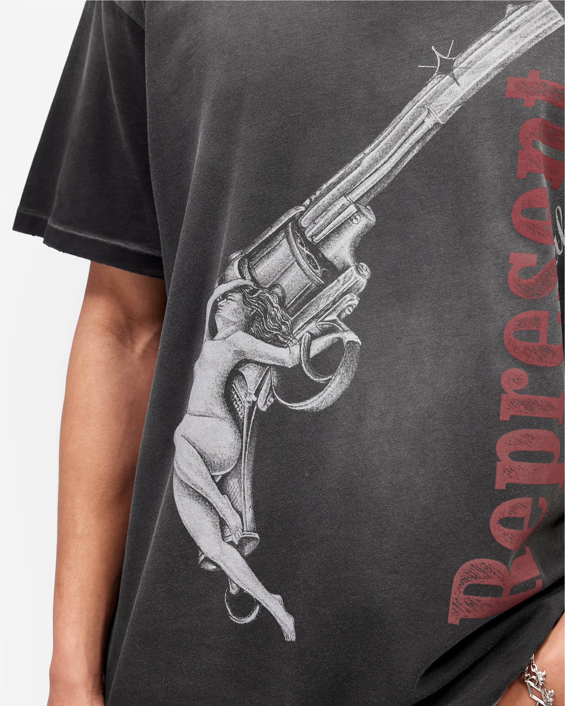Fabric naturally fades with wear. Distressed garments may show further wear.