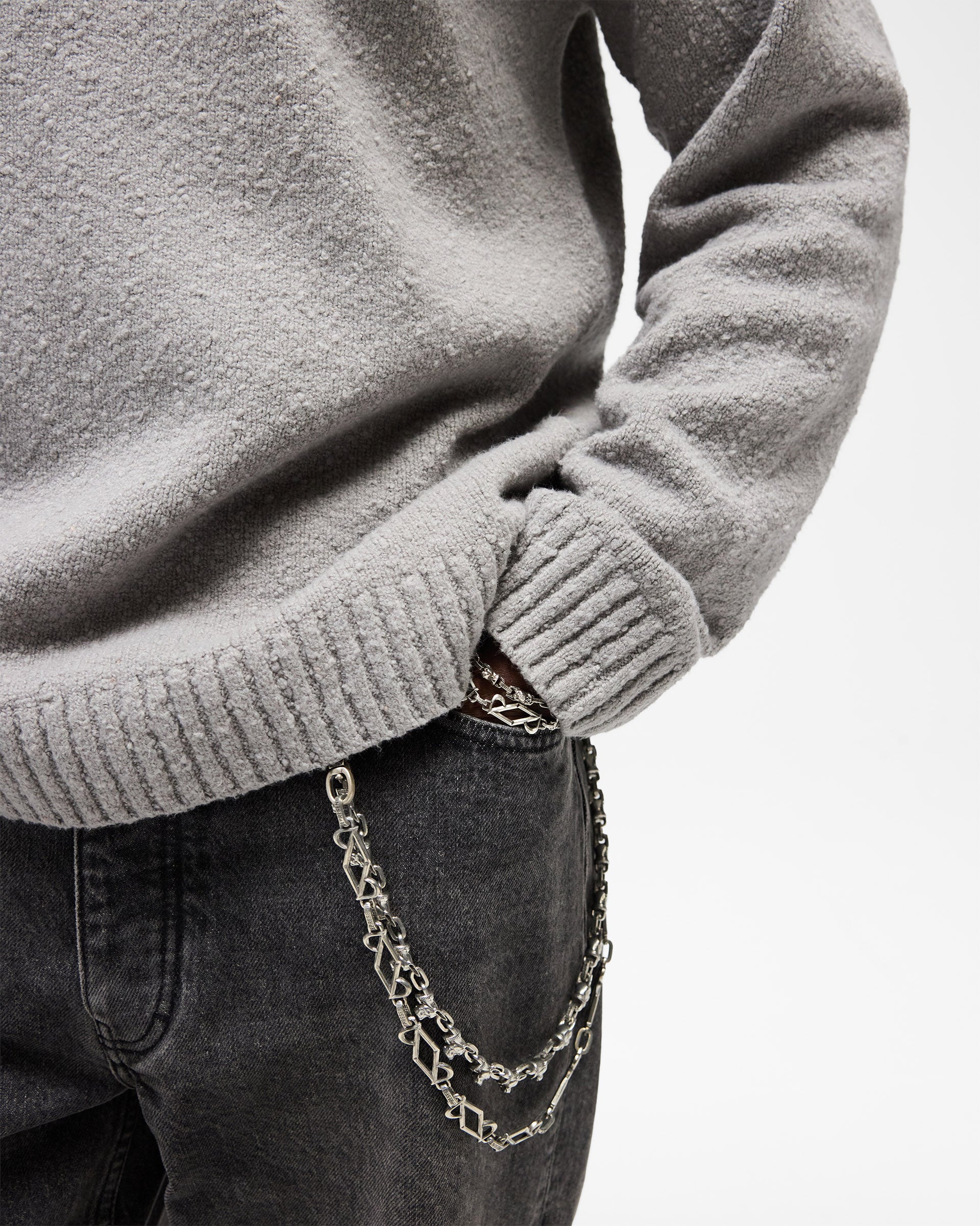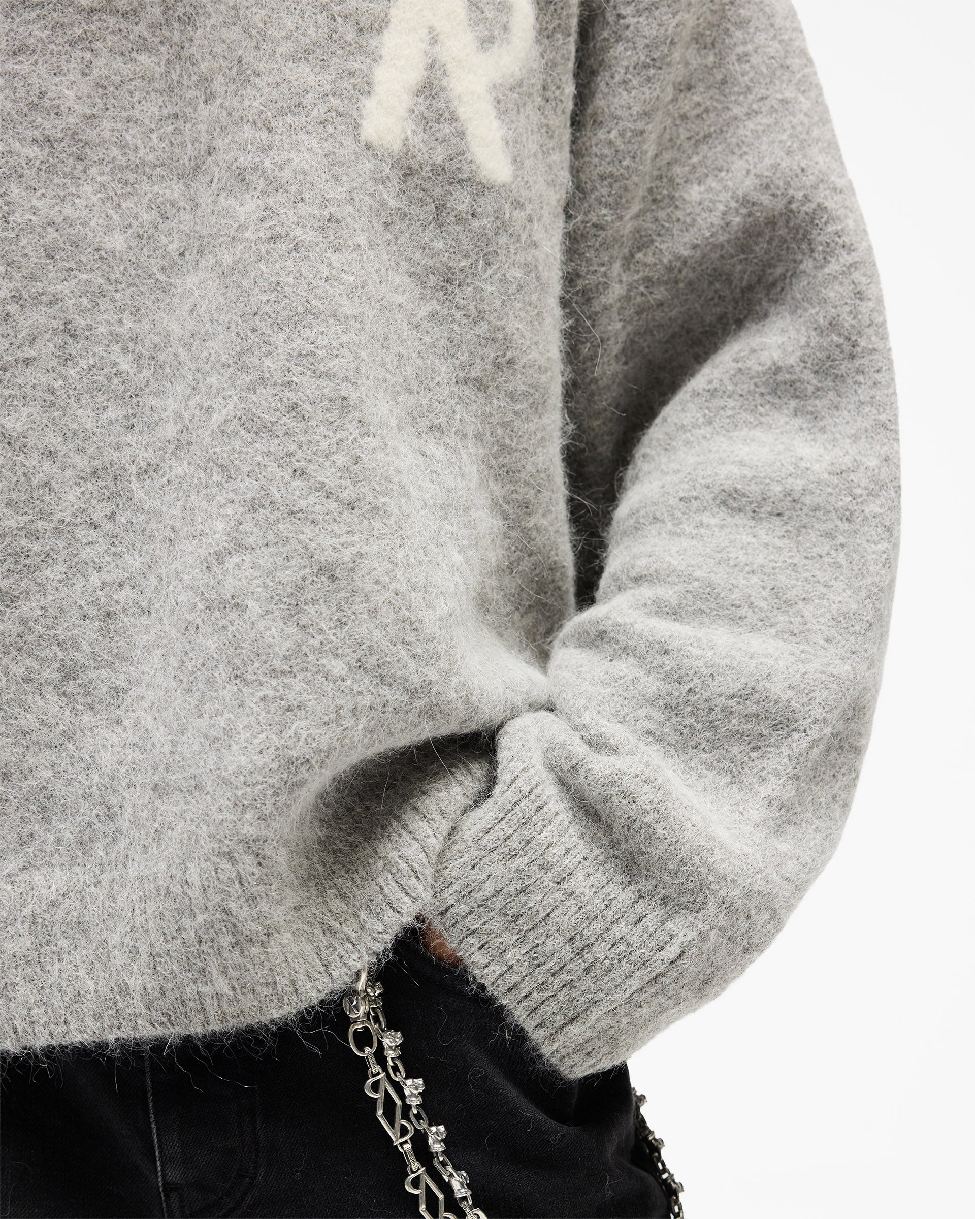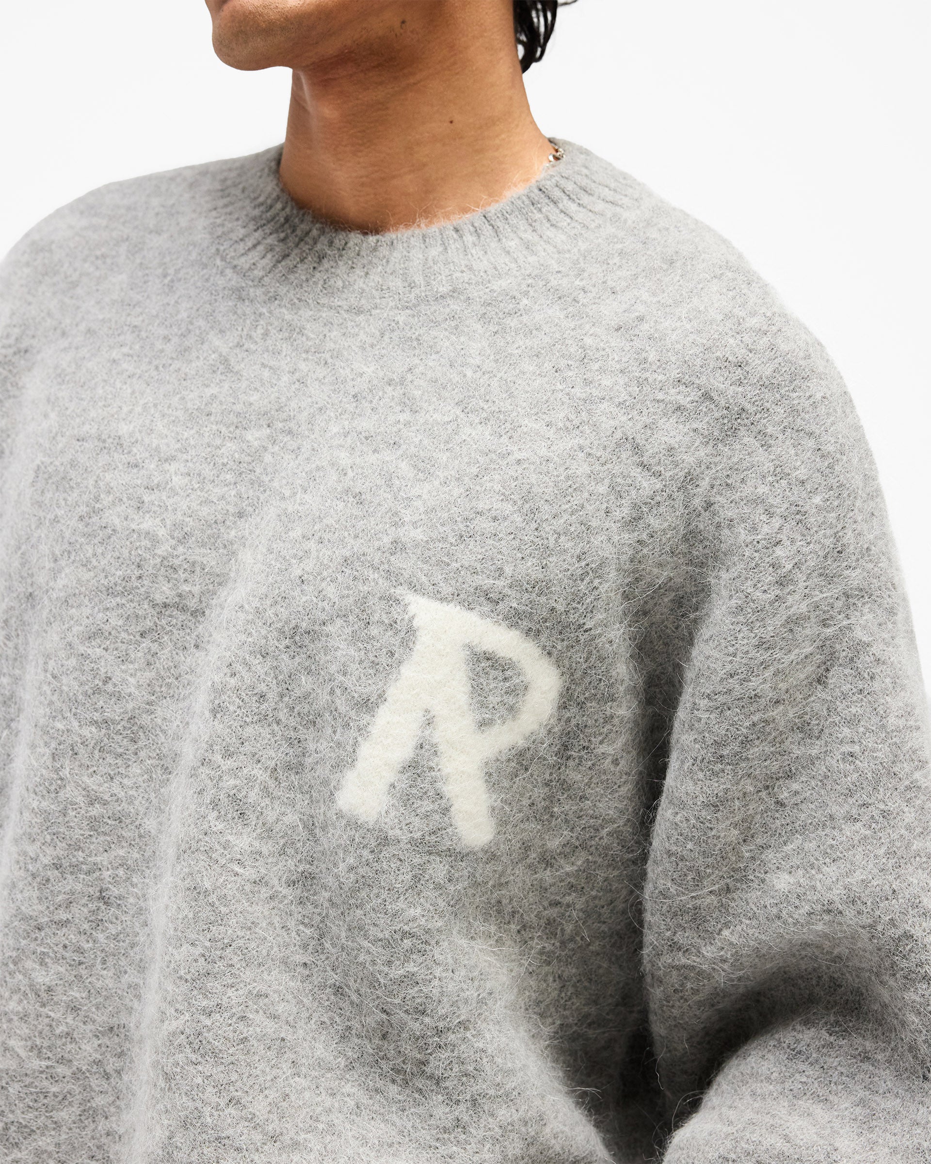 Introducing the Logo Knit Sweater in Grey, a relaxed crew neck sweater crafted from a brushed knit yarn with a soft, textured hand-feel. The intarsia knit Represent initial sits in a contrast white tone to the left chest, adding a clean branding detail against the grey base.