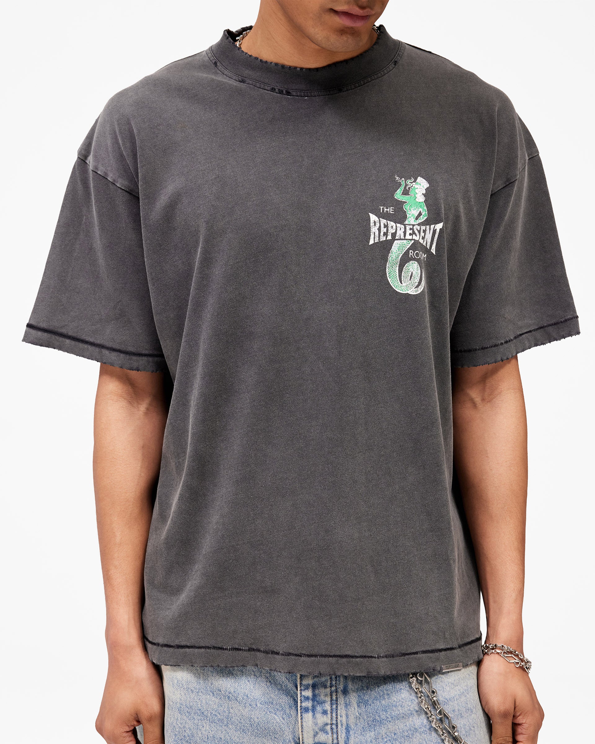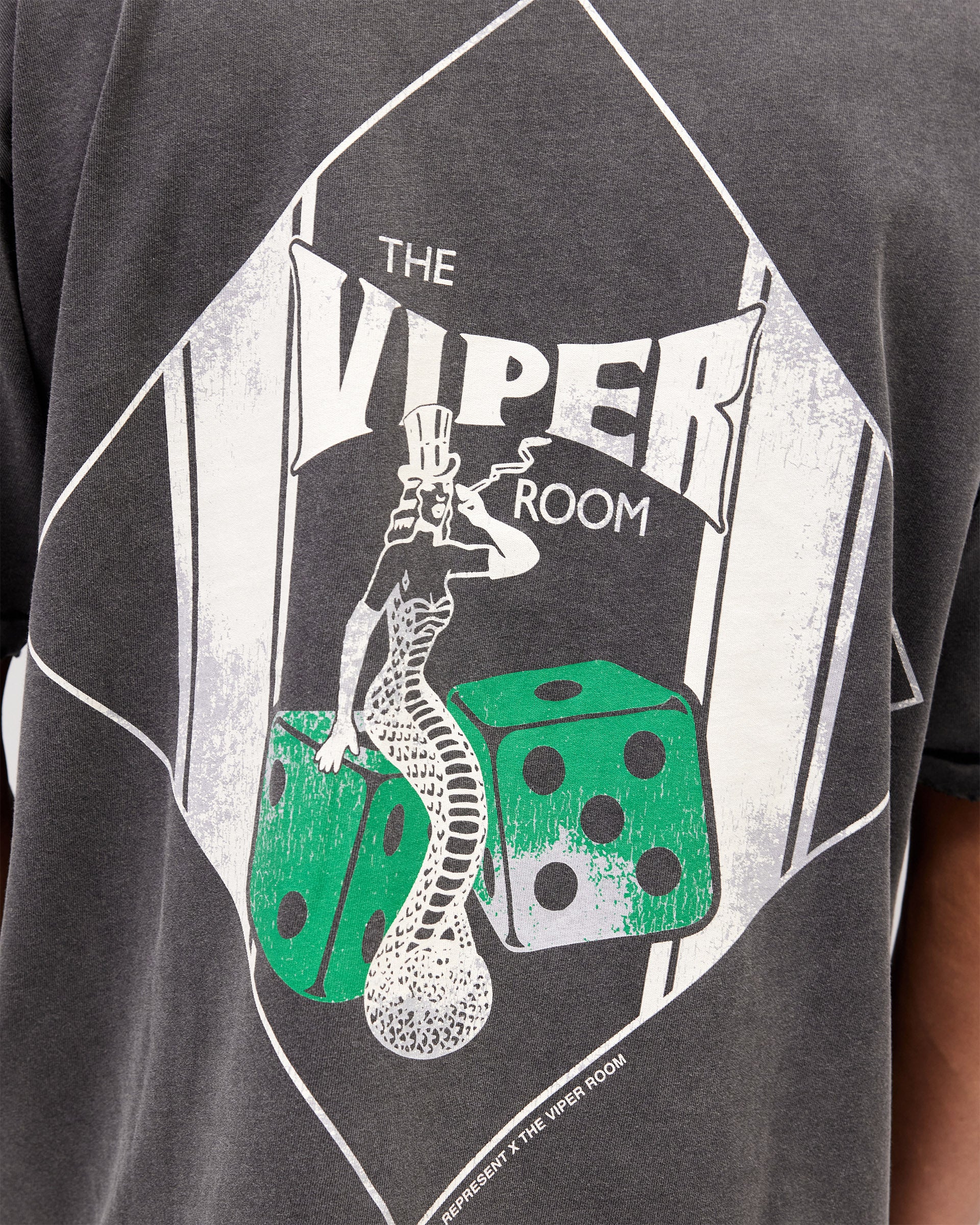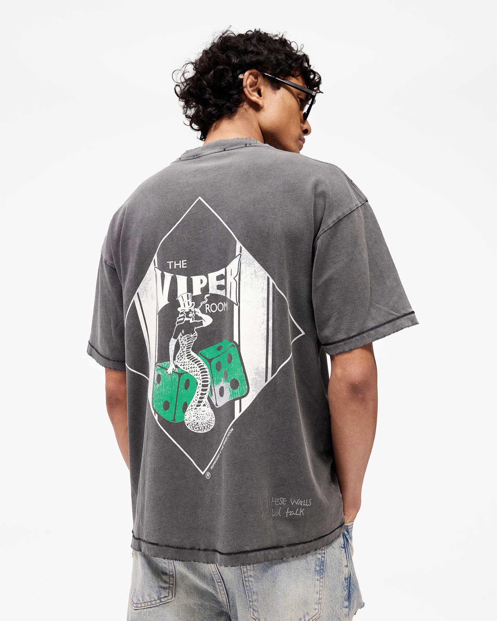 Introducing the Viper Room Dice T-Shirt in Vintage Grey, a piece rooted in the raw heritage of one of Sunset Strip's most legendary venues. Represent x Viper Room celebrates the iconic nightclub opened by Johnny Depp in 1993, a space that defined dark, intimate nightlife culture. This oversized tee channels that storied aesthetic with signature construction touches and an unexpected edge.