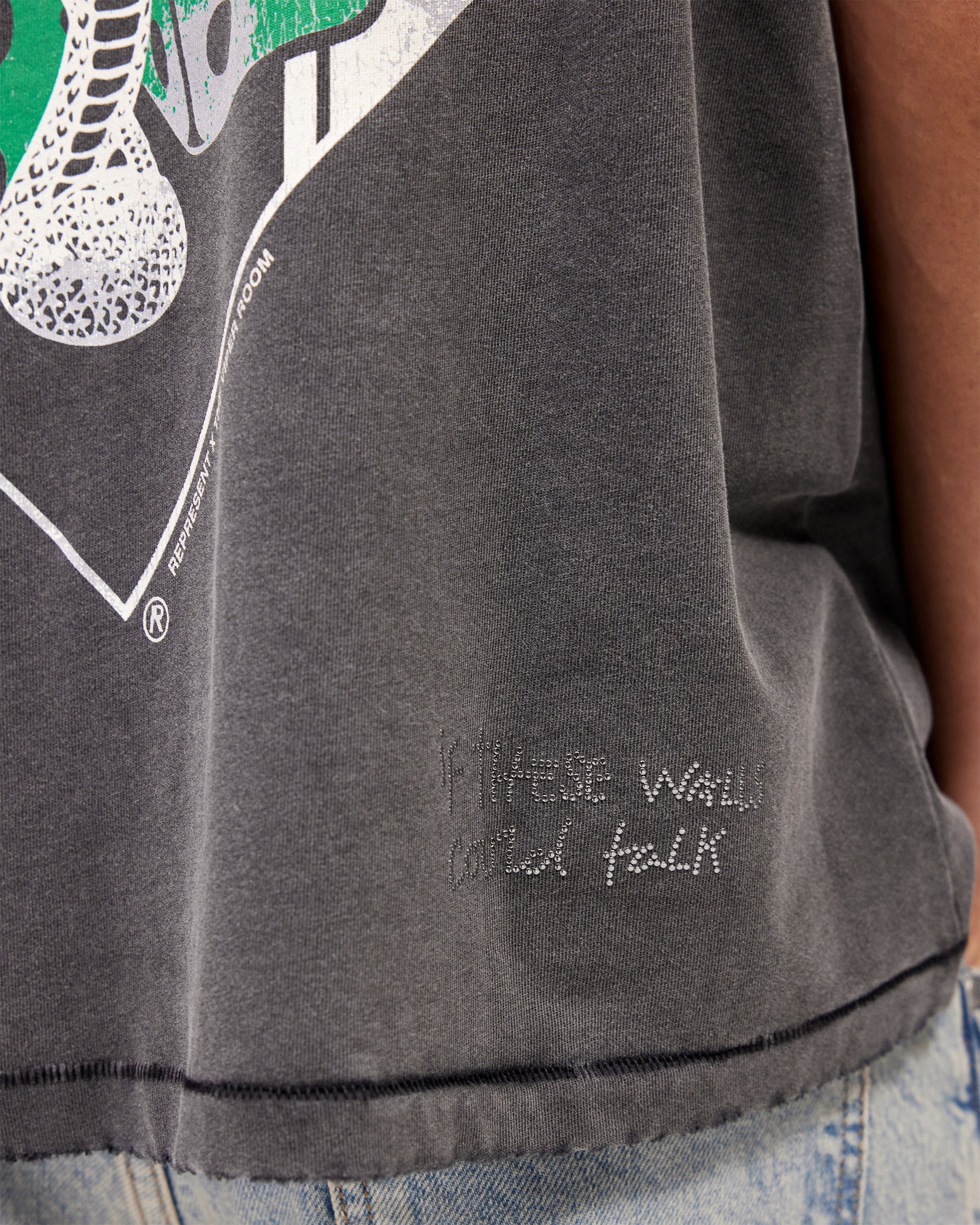 Craft details elevate this beyond a standard graphic tee. A signature metal bar anchors the hem, whilst ladder stitching at the cuff and hem adds intentional construction. Minimal distressing gives it a worn-in feel, and a gem stone embellishment on the back hem introduces a touch of unexpected luxury. It's designed to sit comfortably oversized, with a ribbed collar that grounds the silhouette.