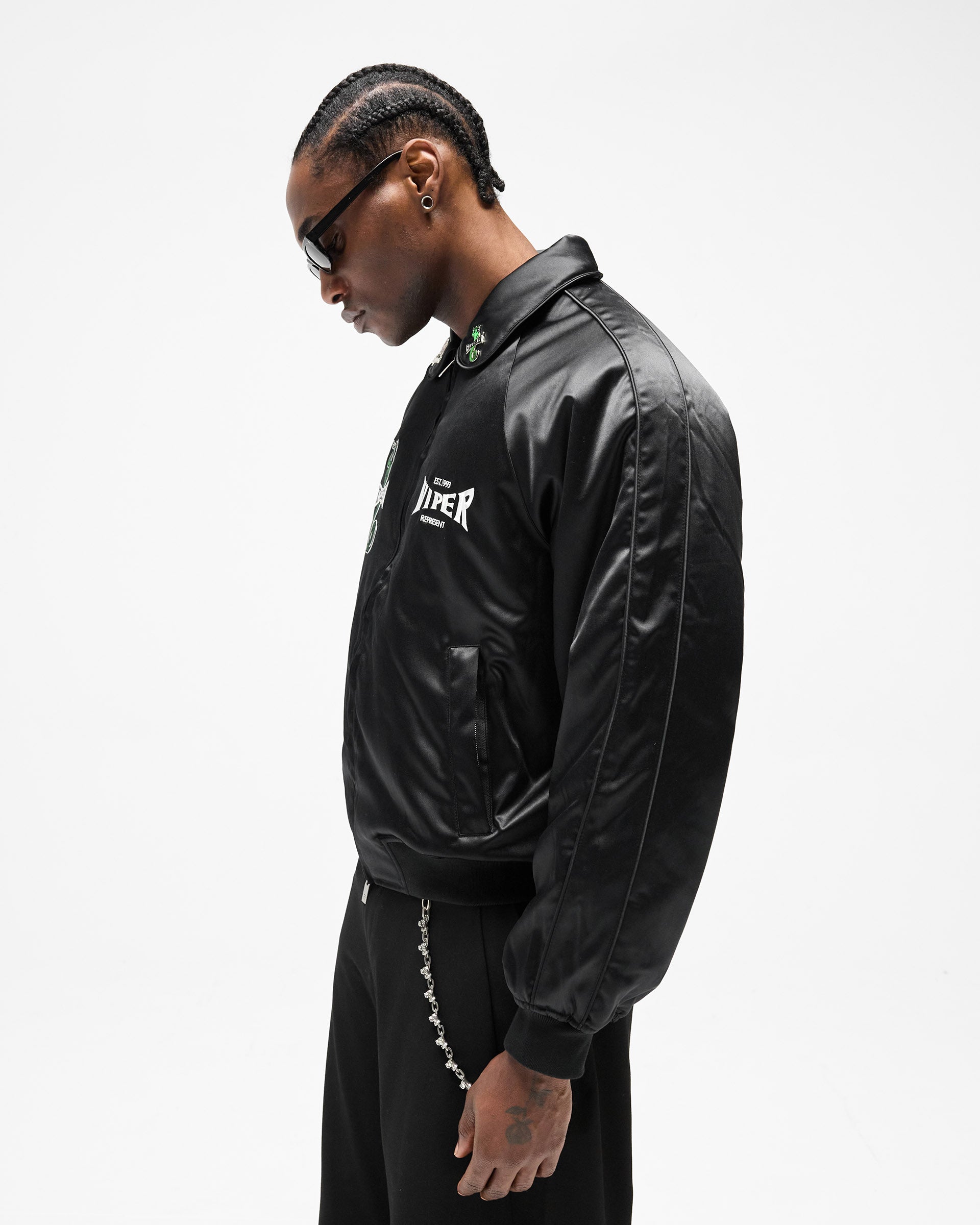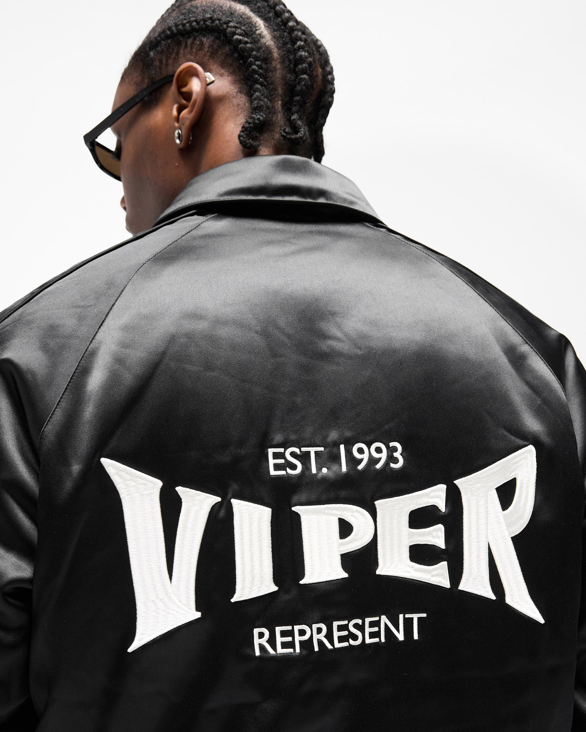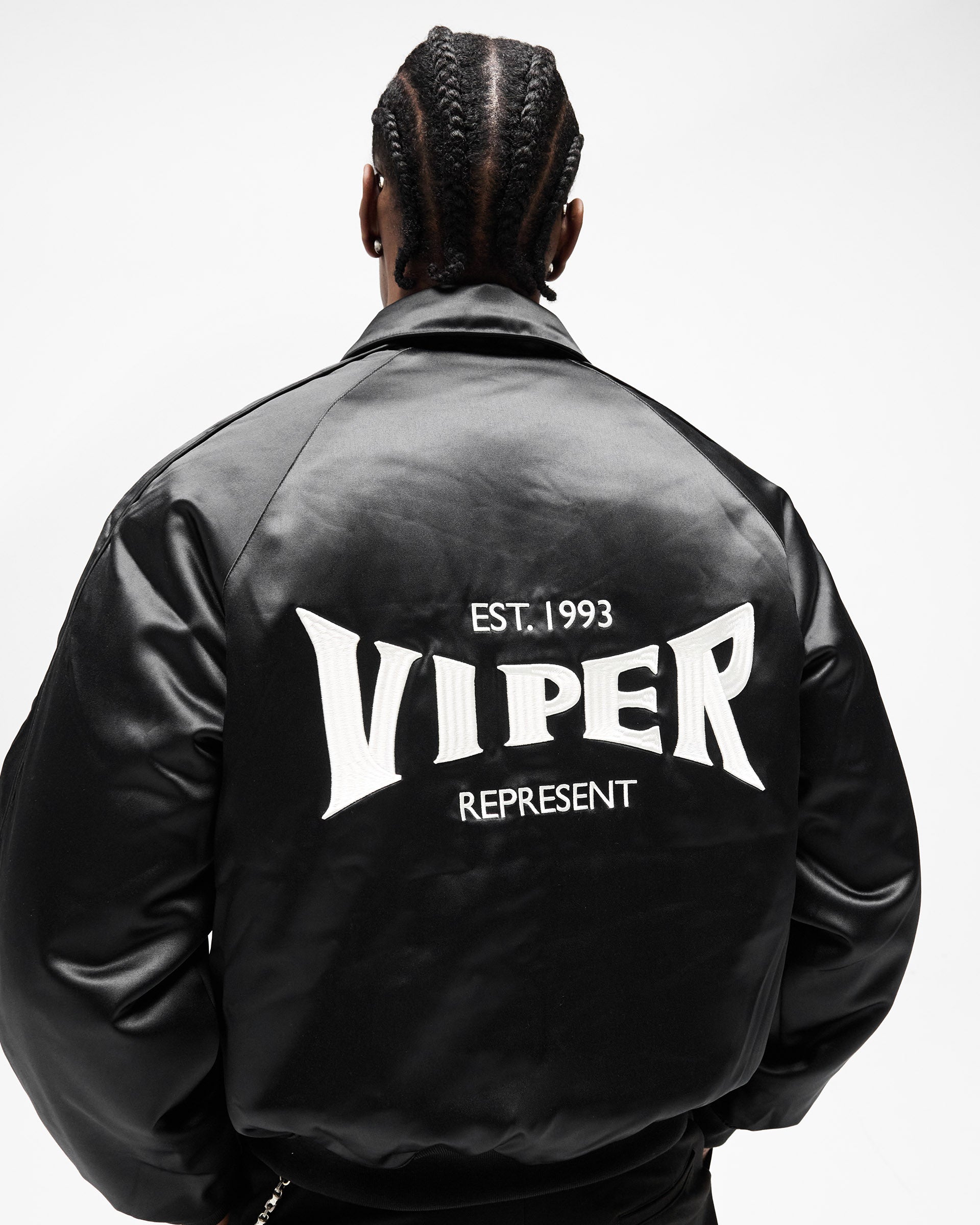 Introducing the Represent x Viper Souvenir Jacket in Jet Black, a cropped souvenir jacket crafted from black satin with a high-sheen finish. Built in collaboration with the Viper Room — one of the oldest buildings on the Sunset Strip, opened by Johnny Depp in 1993 and the definitive venue of a generation.