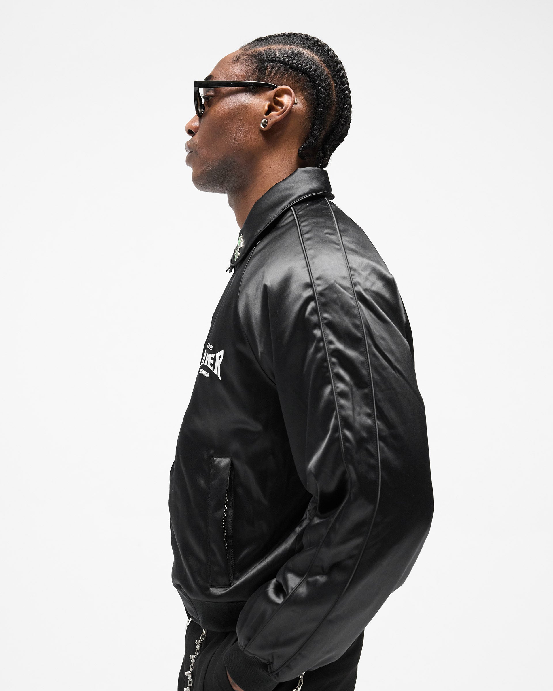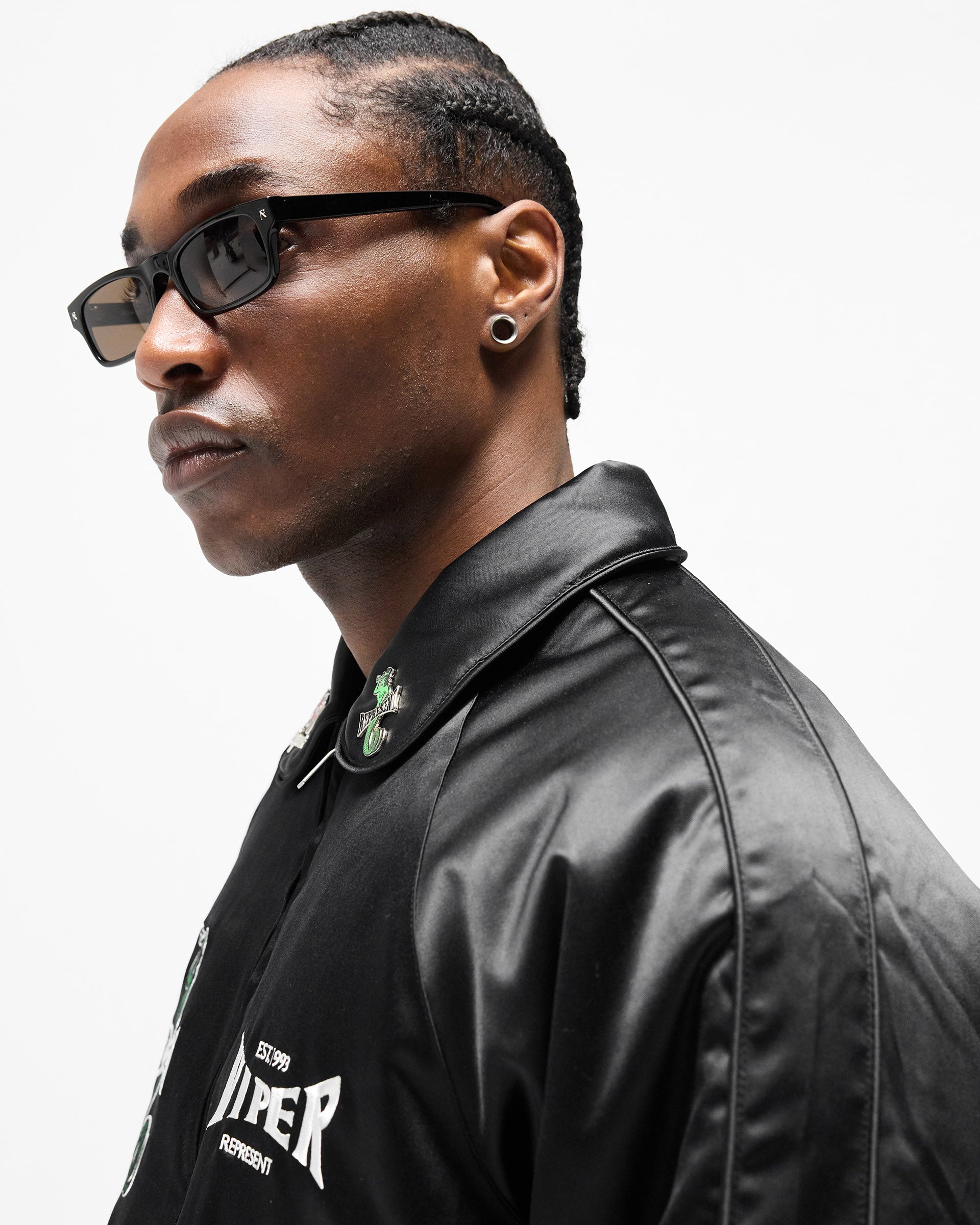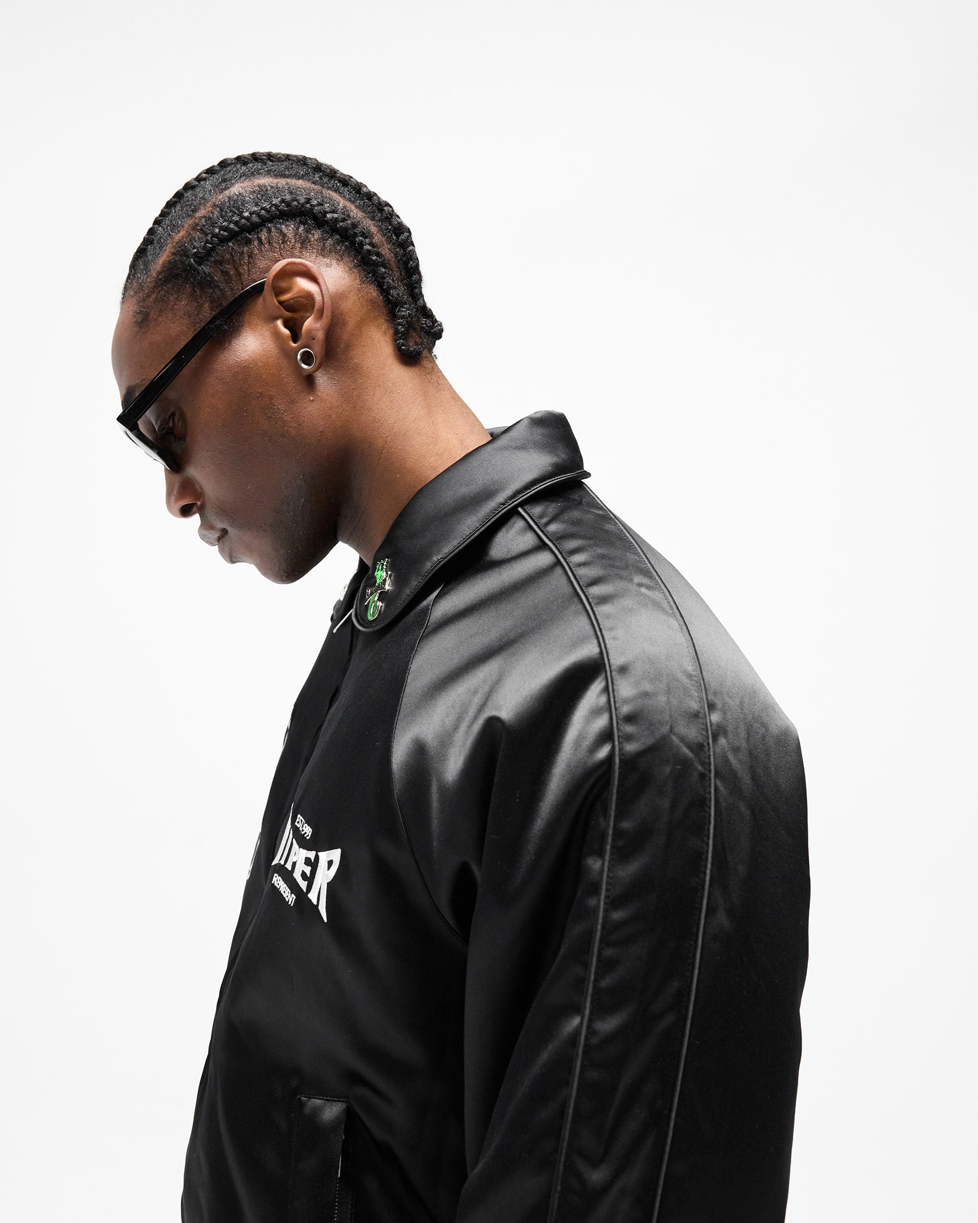 Introducing the Represent x Viper Souvenir Jacket in Jet Black, a cropped souvenir jacket crafted from black satin with a high-sheen finish. Built in collaboration with the Viper Room — one of the oldest buildings on the Sunset Strip, opened by Johnny Depp in 1993 and the definitive venue of a generation.