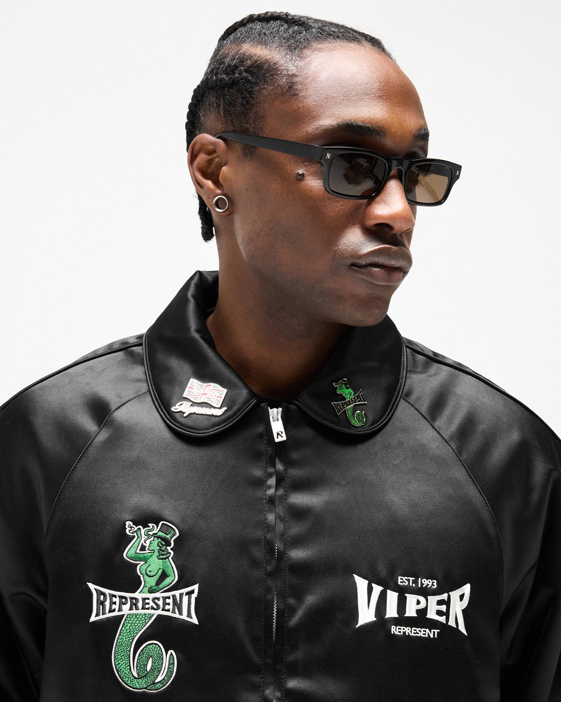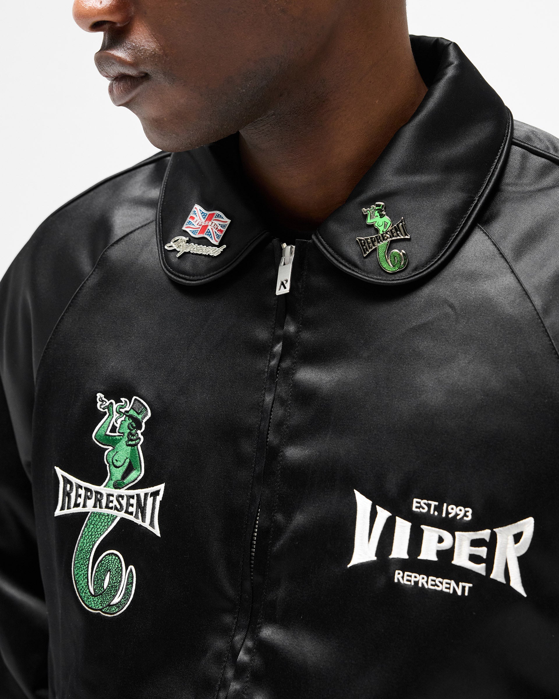 The front features an embroidered viper character wrapped around the Represent logo to the left chest, with the Viper Room Est. 1993 co-branded embroidery to the right. The collar carries a Union Jack flag pin and viper embroidery. The reverse displays a large-scale Viper Room x Represent logo in contrast white embroidery. Finished with a full metal zip closure, side entry pockets, ribbed cuffs and an elasticated hem.